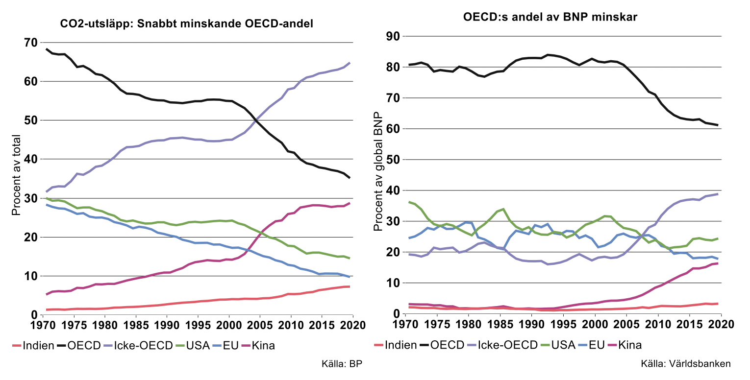 År 1970 stod OECD för nästan 70 procent av utsläppen, en andel som gradvis halverades till 35 procent år 2019 (se bilden till vänster nedan). Notabelt är dock att andelen var relativt konstant under perioden 1985-2000, den kraftiga minskningen skedde initialt i spåren av stora energieffektiviseringar efter OPEC 1 – de kraftiga oljeprishöjningarna 1973-74. Nästa stora rörelse har inträffat under de senaste cirka 20 åren, då OECD:s andel fallit med 20 procentenheter.
