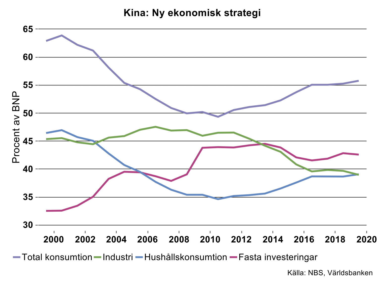 Till stor del kan detta förmodligen tillskrivas den förändrade ekonomiska strategin, där fokus varit mer på privat konsumtion, tjänsteproduktion, etcetera, och mindre på ”CO2-intensiv” tillverkningsindustri och infrastrukturinvesteringar. Det senaste decenniet har investerings- och industriandelarna av BNP fallit rejält medan konsumtionsandelen ökat i motsvarande mån (se bilden ovan). Det finns anledning att förvänta sig att denna tendens består på längre sikt, även om återhämtningen efter pandemin det senaste året, till stor del varit en återgång till den gamla investeringsledda strategin. En fortsatt strukturomvandling skulle i så fall innebära att Kinas utsläpp bromsar in spontant. Dessutom har möjligen Kina uppnått en nivå på Maslows behovstrappa där befolkningen är beredd att till viss del dagtinga med ekonomiskt välstånd för att uppnå andra värden.