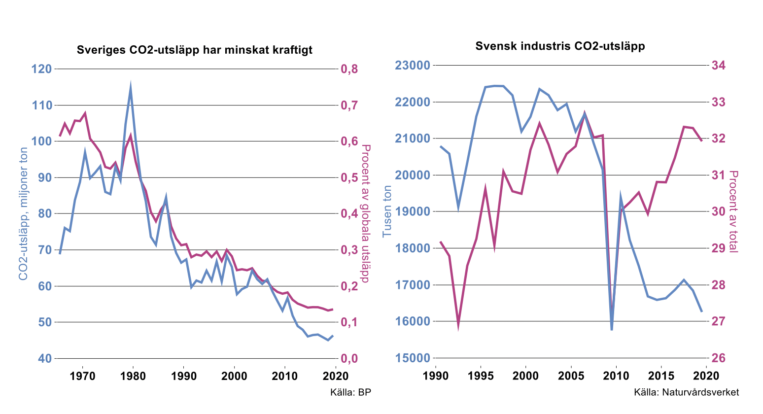 Också utsläppen från svensk industri har haft en tydligt fallande trend i absoluta tal det senaste decenniet. Eftersom industrins konjunktursvängningar är betydligt kraftigare än för ekonomin i sin helhet har dess andel av svenska CO2-utsläpp varierar rejält över tid. Under recessionen efter finanskrisen, som drabbade industrin särskilt hårt, föll andelen kraftigt för att sedan åter öka under de goda industriåren 2014-2019.