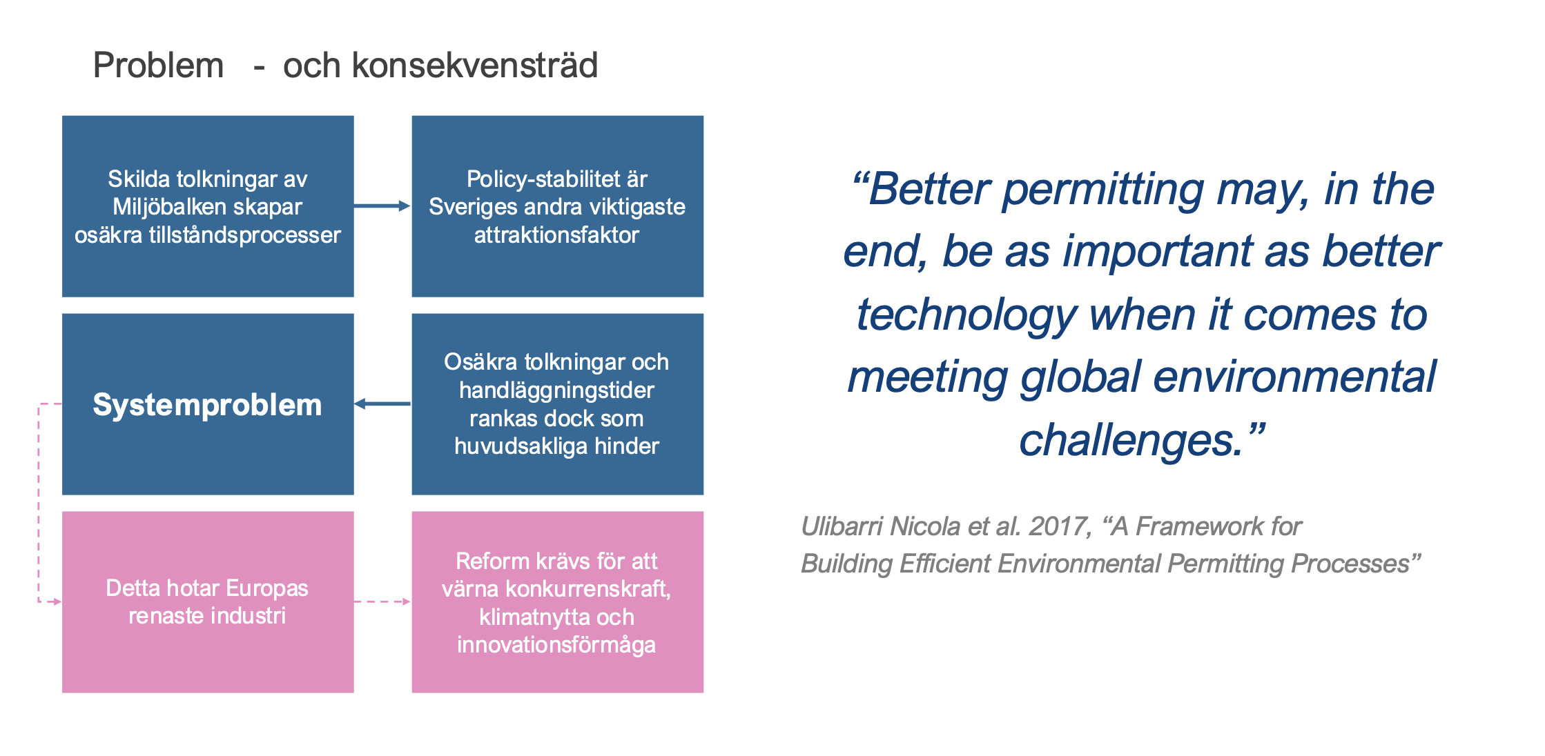 Givet förutsägbarhetens centrala roll för Sveriges konkurrenskraft är det oroande att över 24 procent av företagen upplever problem med just handläggningstider och regeltolkningar. Forskningsrapporter (Ulibarri et al. 2017) pekar på att långa handläggningstider är särskilt vanliga bland företag inom den gröna industrin och att byråkratin kan öka kostnaderna för gröna energiprojekt med 50 procent. Forskningsstudier av gruvindustrin visar att förutsägbarhet är viktigare än strikta miljökrav i sig då ledande företag redan använder den bästa utrustningen för att kunna vara konkurrenskraftiga globalt. Förutsägbara tillståndsprocesser är dock avgörande för att veta om investeringar får vara kvar om tio år.