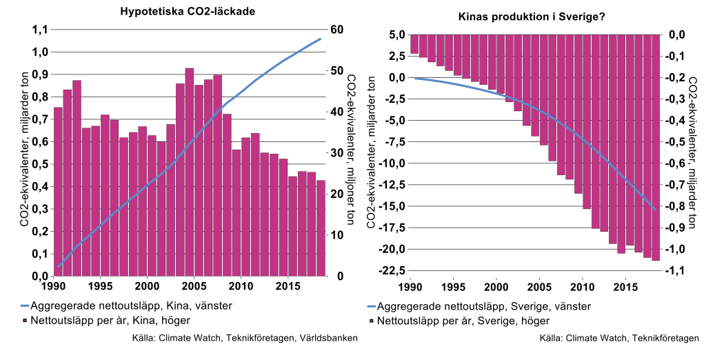 Den vänstra bilden nedan visar hur de globala CO2-utsläppen från industrin hypotetiskt hade utvecklats om svensk industriproduktion under åren 1990-2018 skett med Kinas klimatavtrycket istället för med Sveriges: tänk ”om svensk industri flyttat till Kina 1990”. Staplarna visar hur mycket större de årliga globala industrirelaterade utsläppen blivit och den heldragna kurvan den ackumulerade effekten under perioden: 1,1 miljarder ton CO2-ekvivalenter motsvarande ungefär 2 procent av global industrins totala utsläpp under perioden. Detta är det hypotetiska så kallade CO2-läckaget om svensk industri flyttat till Kina 1990.