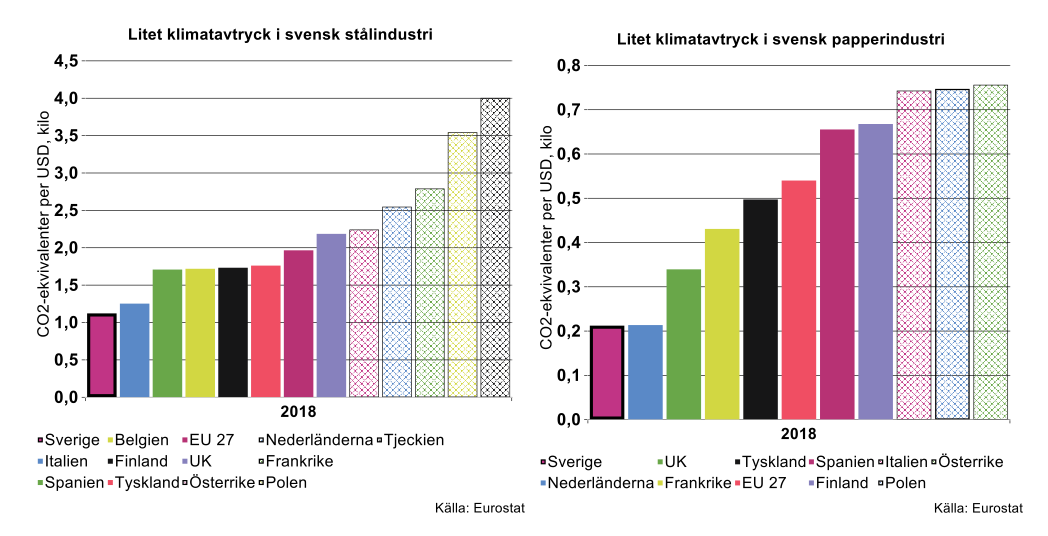 Lämnar vi Teknikföretagens branscher framträder samma mönster: i såväl stål- som pappersindustrin gör svensk industri minst klimatavtryck jämfört med andra betydande producenter (se bilderna nedan).