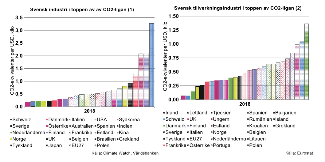 Bilderna ovan visar att rankingen skiljer sig något mellan EU-länderna i de två studierna. Exempelvis rankas svensk industri före dansk enligt Climate Watch men efter enligt Eurostat. Hursomhelst kommer svensk industri mycket bra ut i bägge mätningarna. Sålunda leder enligt Eurostat, produktionen av en USD förädlingsvärde i svensk industri till 0,24 kilo CO2-usläpp mot 0,39 kilo i EU-genomsnittet. Motsvarande relation enligt Climate Watch är 0,21/0,58 kilo per USD. Jämfört med Sverige är exempelvis kinesisk industris klimatavtryck tiofalt större.
