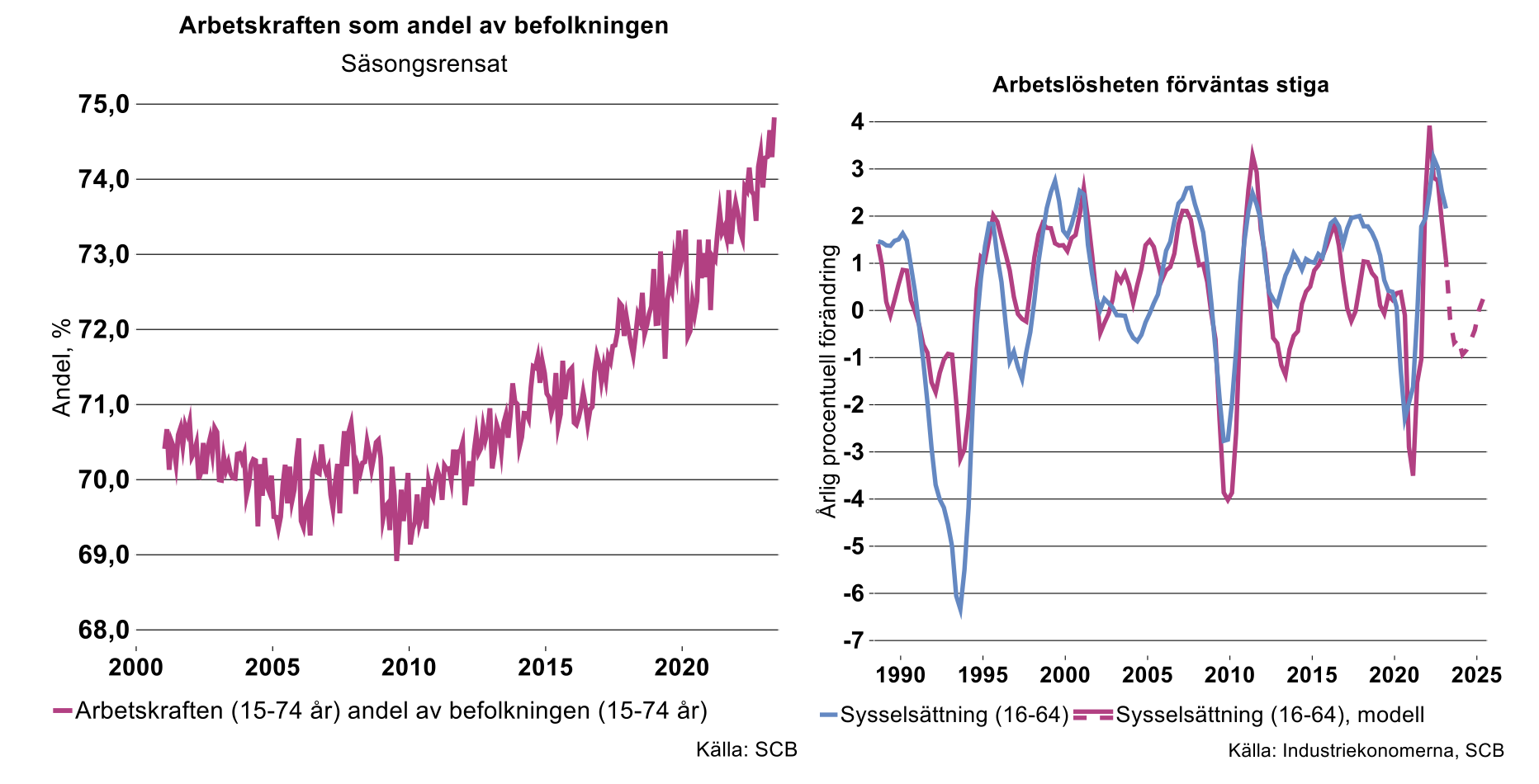 Arbetslösheten väntas dock öka under året samt nästkommande år. Näringslivet rapporterar lägre efterfrågeförväntningar, vilket minskar benägenheten att nyanställa. Det är dock stor kompetensbrist inom flera områden, såväl inom kunskapsintensiva branscher som inom branscher som kräver en lägre utbildning. Det, i kombination med att kapacitetsutnyttjandet inte har återhämtat sig efter de nivåerna som observerades under pandemin, kan förklara varför företagen väljer att behålla personal i större utsträckning än tidigare. Att arbetslösheten förväntas stiga är inte är förvånande med tanke på det svåra ekonomiska läget som Sverige befinner sig i. Det starka sambandet mellan BNP-tillväxt och tillväxten i sysselsättningen är tydligt, se figur nedan till höger.