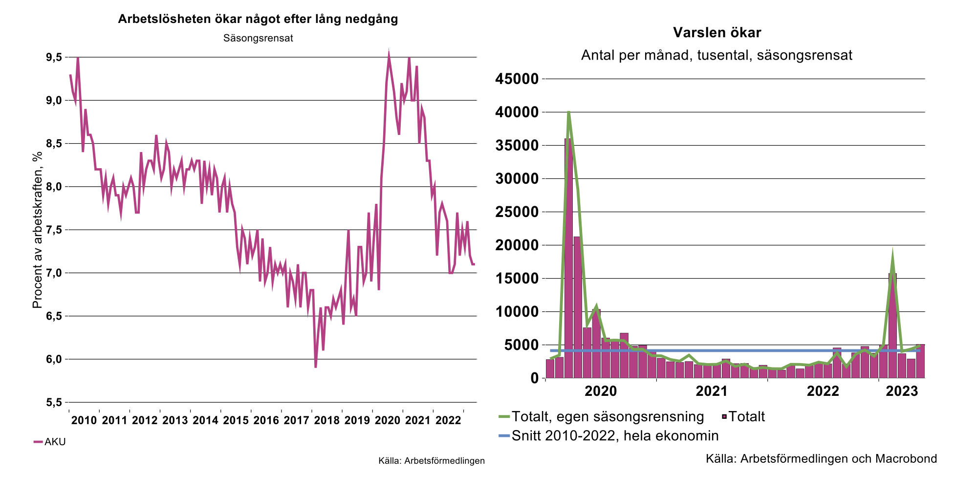 Andelen personer som är arbetslösa ökade något jämfört med april och enligt AKU var 7,2 procent av arbetskraften arbetslösa i maj, säsongsrensat, vilket innebär en mindre uppgång. Samtidigt som arbetslösheten ökar något börjar orosmolnen ansamlas på arbetsmarknadshimlen. Antalet varsel har varit relativt låga under en längre period för att öka något under den tidiga våren. Sedan dess har antalet varsel legat relativt oförändrat ett par månader för att öka något i maj.
