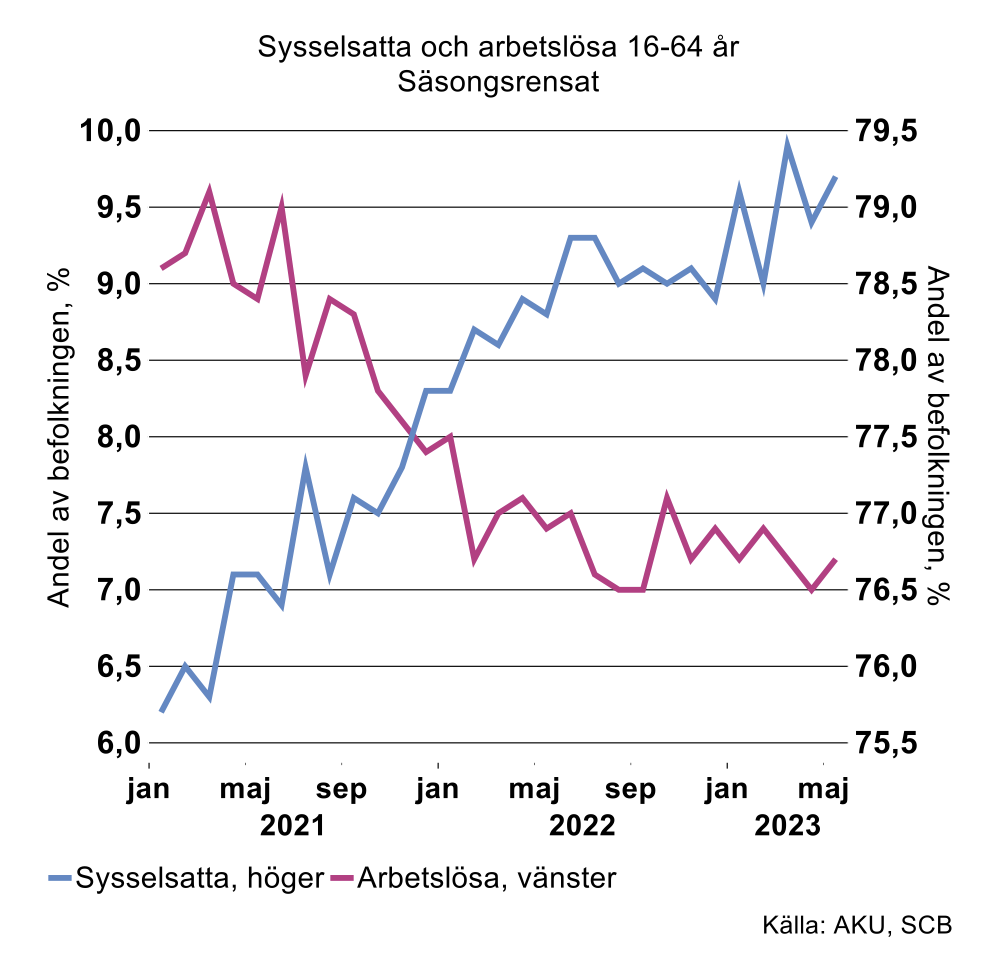 Drygt 30 000 fler blev sysselsatta i maj jämfört med april. Enligt den icke säsongsrensade statistiken blev det en uppgång i antalet sysselsatta. Den månadsvisa statistiken är dock volatil och det presenterade resultatet ska därför tas med en nypa salt.