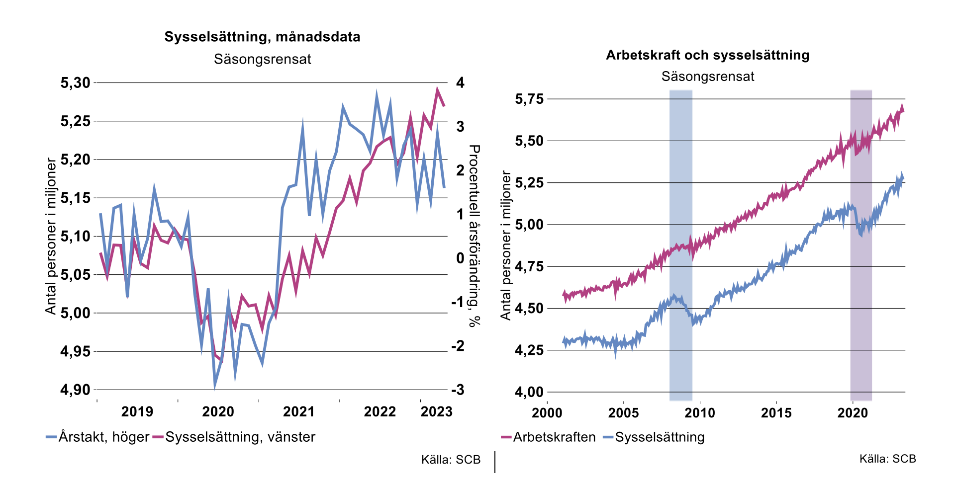 Utvecklingen av antalet sysselsatta på lite längre sikt visar att det skett en tydlig återhämtning efter pandemin men att uppgången har mattats av under senvåren. Förhållandet mellan antalet personer som ingår i arbetskraften och antalet personer som är sysselsatta har följt varandra väl sedan i början av millennieskiftet, vilket även innebär att arbetslösheten under de senaste drygt 20 åren har legat relativt stabilt.[1] Detta stämmer, förutom ett par undantag.